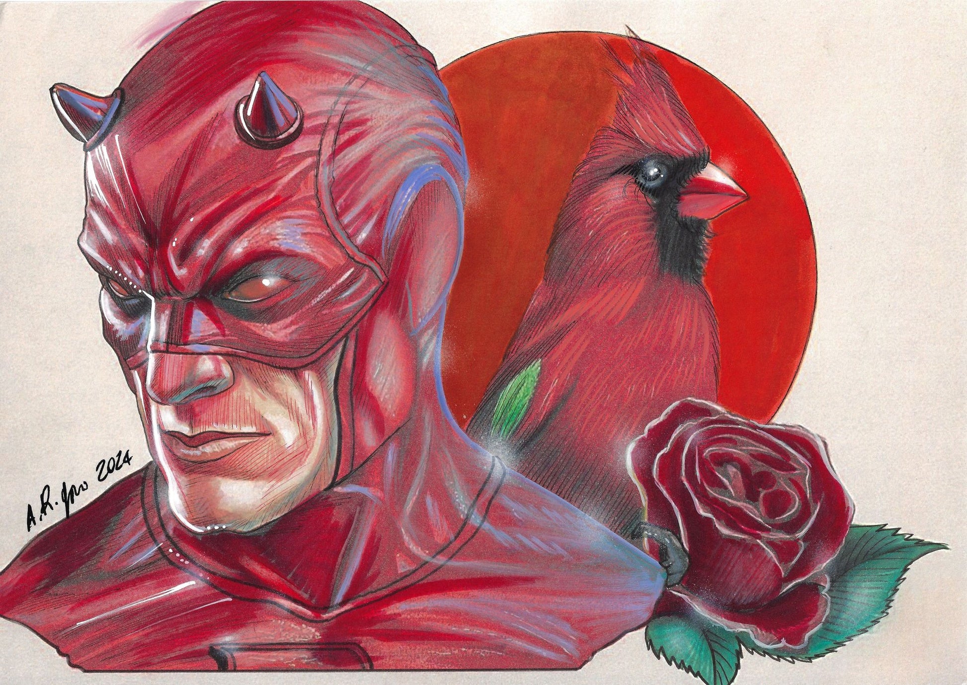 AURELIO RIGONI A4 ORIGINAL SKETCH OF DAREDEVIL WITH CARDINAL & ROSE